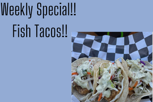 Our Fish Tacos are made to order and come with Fried Fish, Slaw, and choice of sauce.